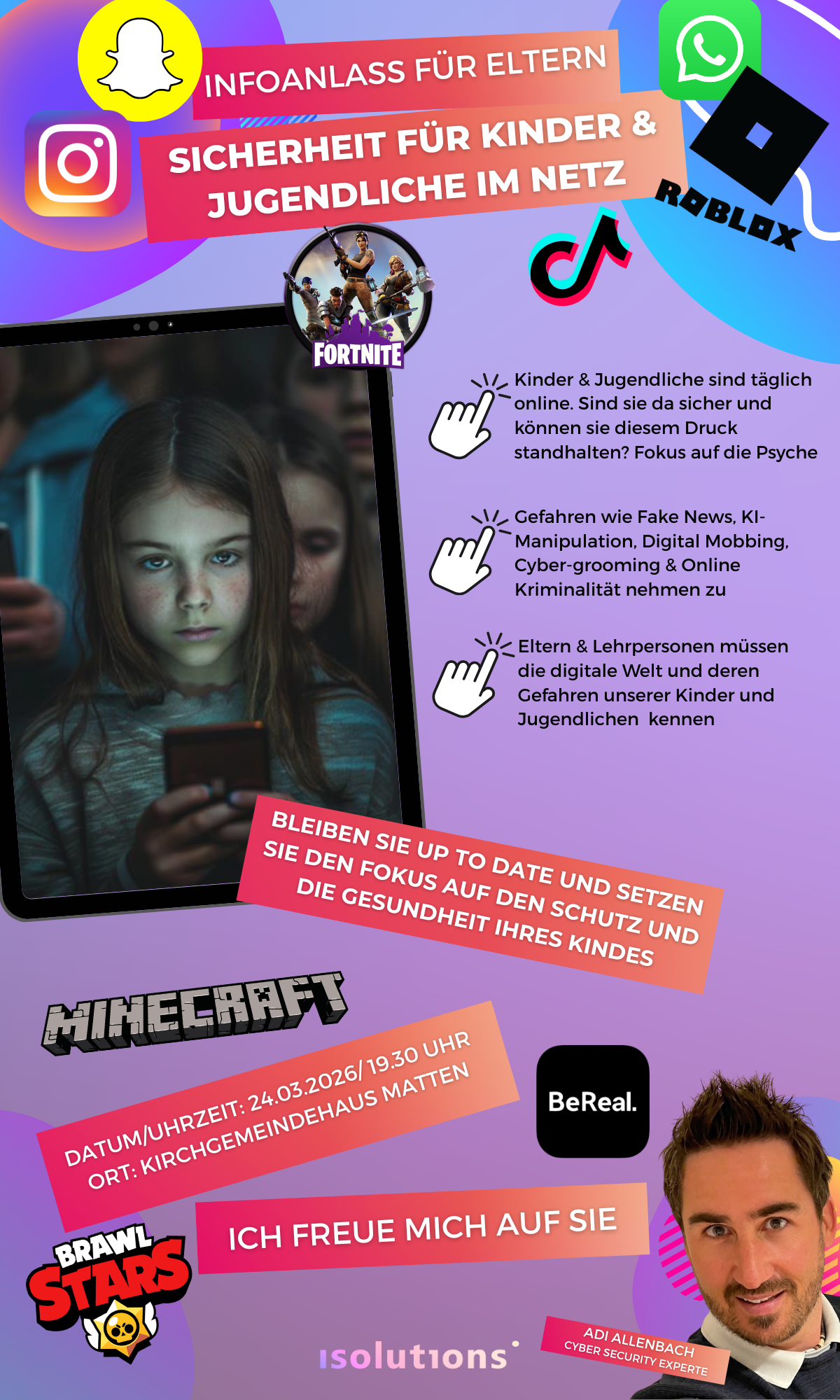 Dienstag, 24. März 2026 Infoanlass für Eltern, Sicherheit für Kinder & Jugendliche im Netz