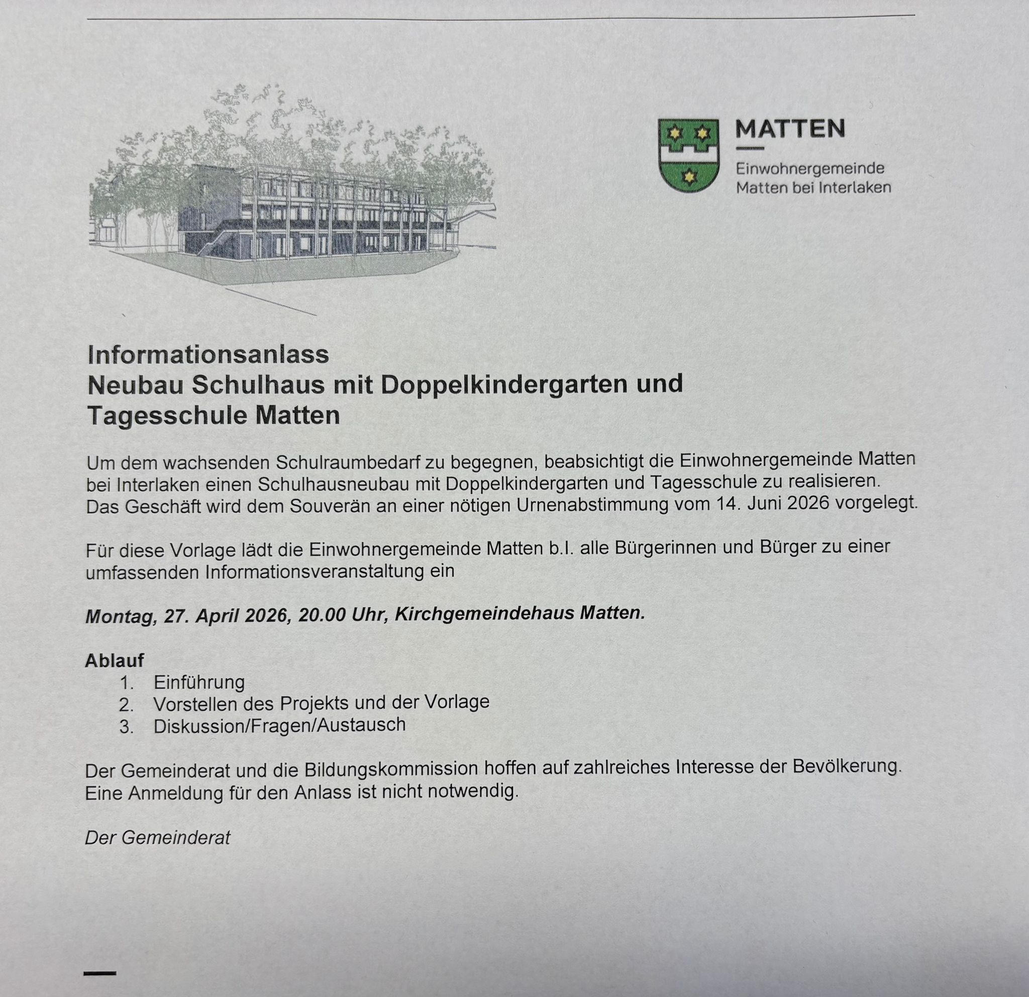 Montag, 27. April 2026 Info-Anlass Doppelkindergarten und Tagesschule